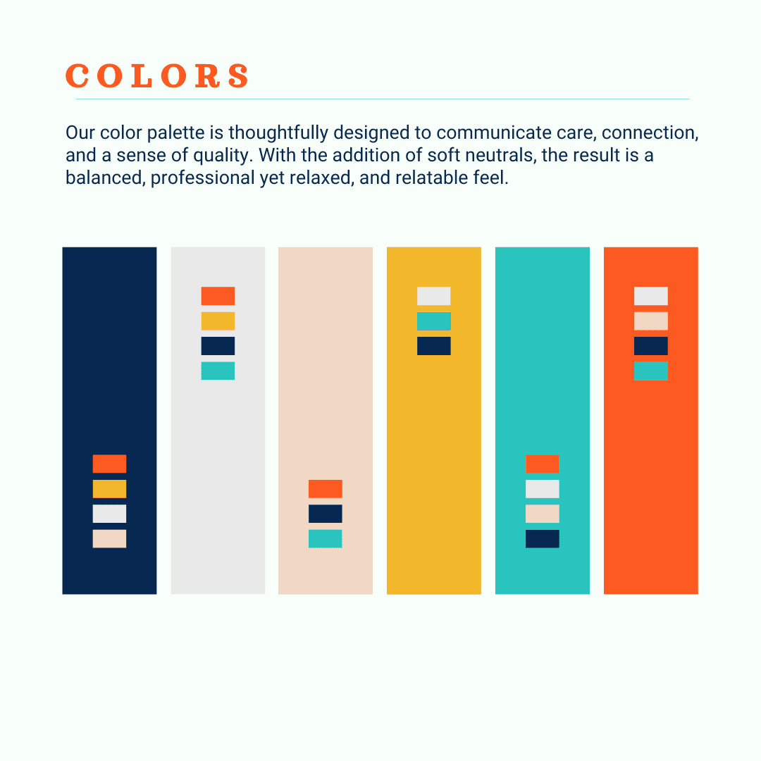 A minimal, connection-focused logo, soft neutral color palette, and a mix of serif and sans-serif typography convey trust, clarity, and approachability. Gentle icons, authentic care-centered imagery, and playful patterns add personality, creating a brand experience that feels compassionate, relatable, and welcoming.